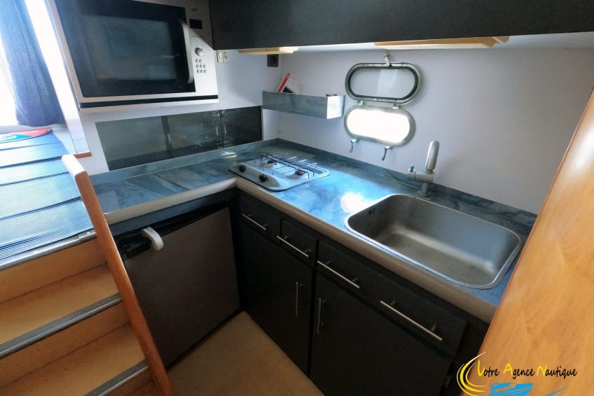 - Une cuisine équipée : avec un évier, une plaque gaz 2 feux, une VMC, un four micro-ondes encastré, un frigo électrique 12v/220 v, un évier avec eau froide et chaude sous pression, des prises 220 V, des rangements.