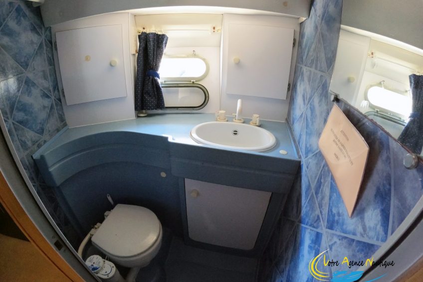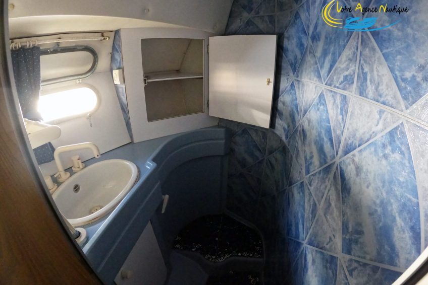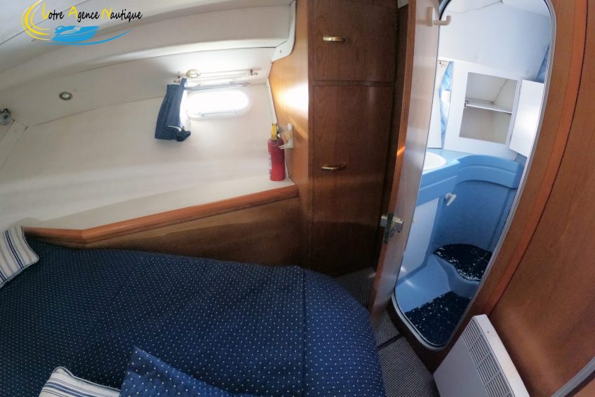 À l’avant du navire, vous trouverez une chambre style “suite parentale” avec un lit 2 places positionné à la française. Des rangements et une porte permettent un accès direct à la salle d’eau.