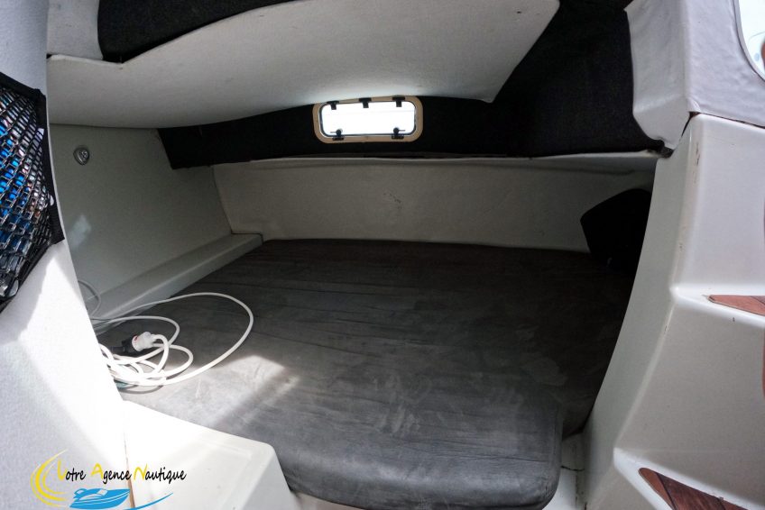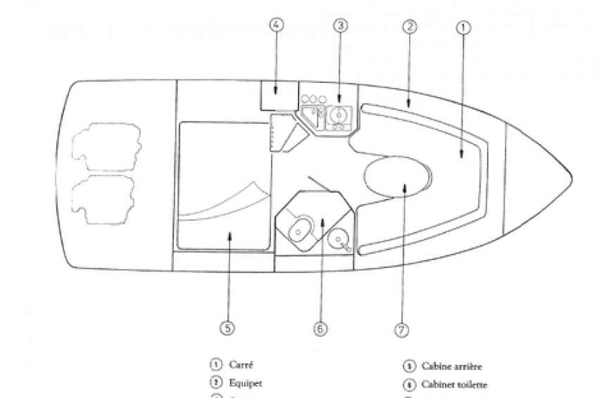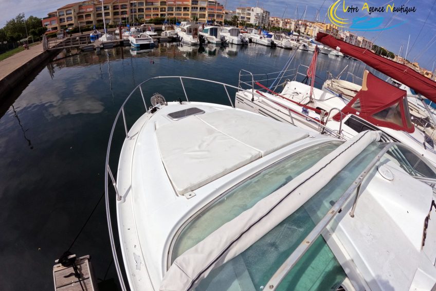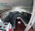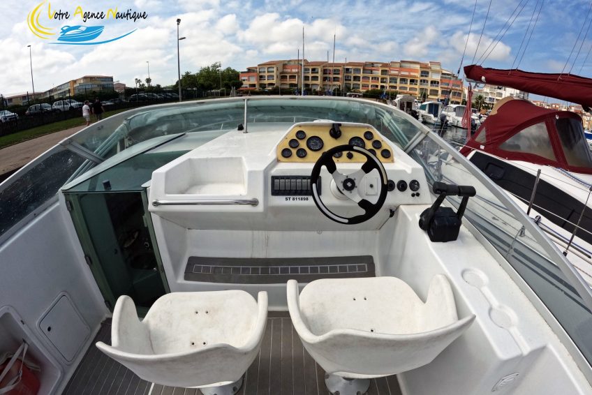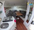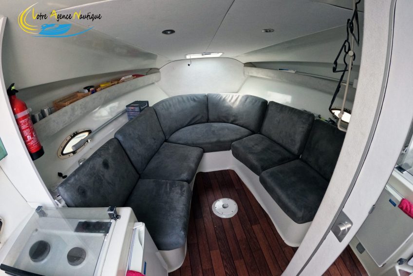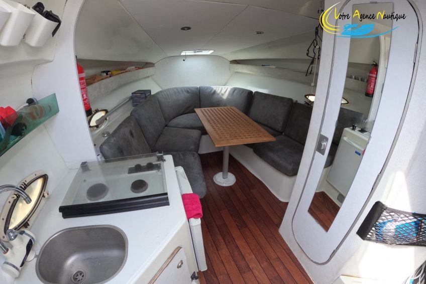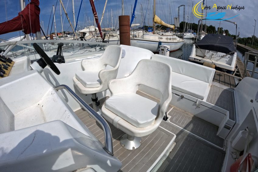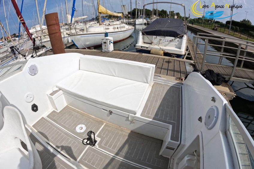 Une belle table avec une banquette arrière, les sièges du pilote et du co-pilote à 360° permettent de conduire avec aisance ou de profiter de ses convives attablés, taud de soleil dépliable. Sur l’avant un bain de soleil 2 places.