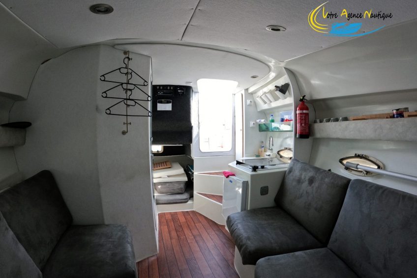 À l’avant du navire, vous trouverez un salon en V, transformable en lit 2 places et de nombreux rangements.