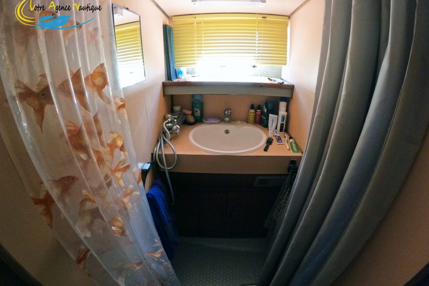 Sur tribord : La salle d’eau avec un lavabo, une douche avec mitigeur indépendant.