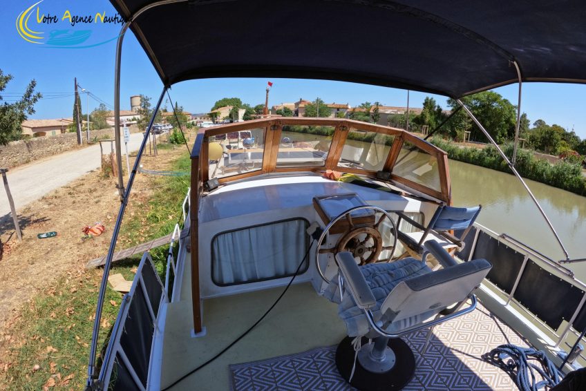 Sur l’arrière, un grand pont terrasse avec le poste de pilotage extérieur, aménageable avec un salon extérieur. Recouvert par un taud de soleil.