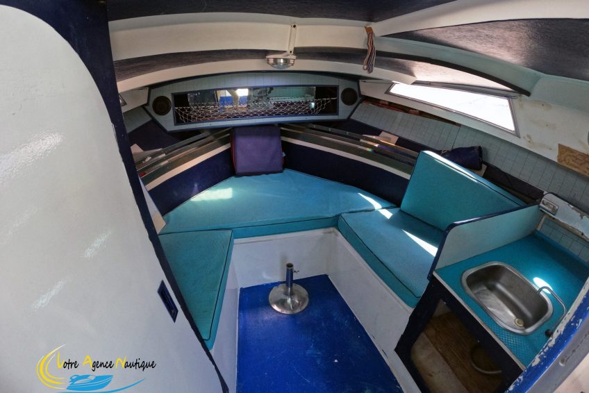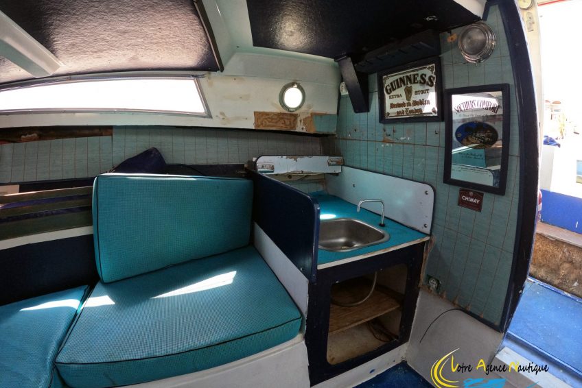 À l’avant de la cabine, des banquettes en V transformables en lit double couchage, de nombreux rangements.